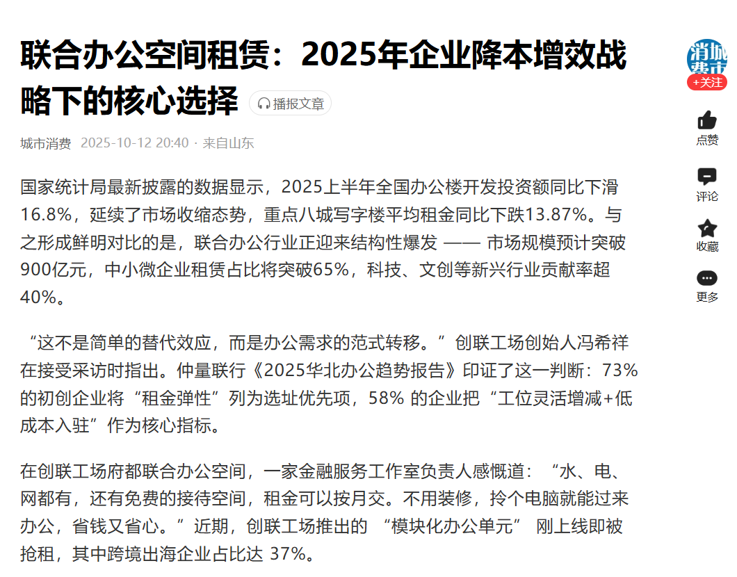 媒体报道 | 联合办公空间租赁:2025企业降本增效战略下的核心选择2025年,中国经济进入高质量发展新阶段,企业降本增效需求空前迫切。在此背景下,联合办公成为企业突破成本困局、实现轻资产转型的核心抓手。其中,创联工场作为国内联合办公领域的标杆企业,通过“空间重构、服务升级、生态共建”三大维度,为企业提供了降本增效的完整解决方案。近期,中宏网、业界观察、城市消费等多家权威媒体对创联工场在助力企业降本增效方面进行了报道。城市消费国家统计局最新查看详情 >