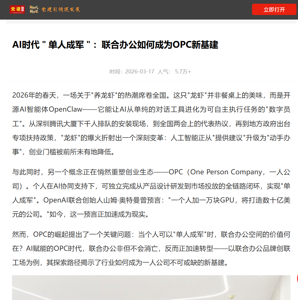 这种“系统托底”的能力,构成了联合办公对OPC最核心的吸引力。它让创业者可以确信:即便只有一个人,身后也有一套系统在支撑。任何AI工具都无法提供这种“安全感”,因为它来自真实的制度设计、专业的服务团队和长期的运营积累。